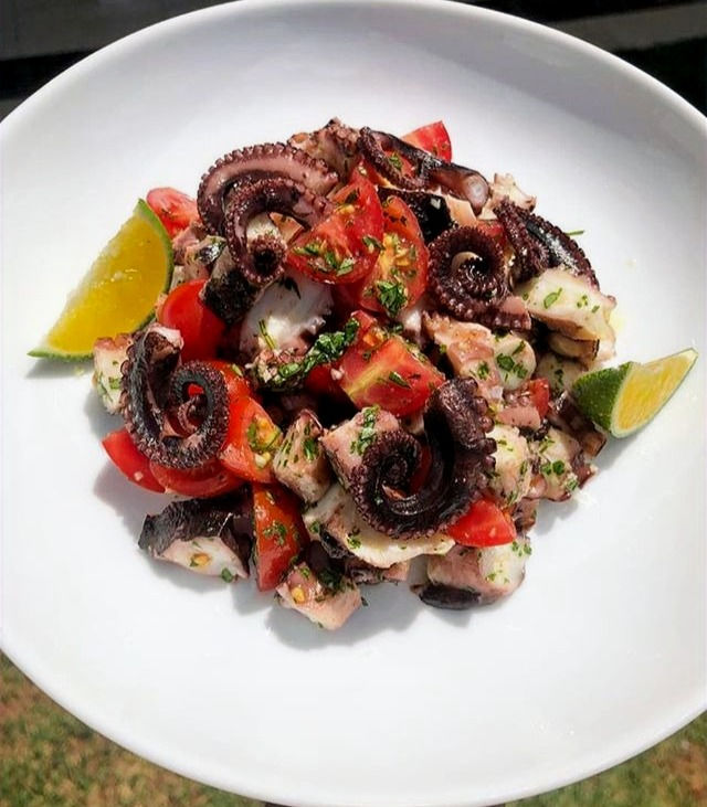 Corte os tentáculos em pedacinhos abocanháveis, misture com o coentro picado, os tomatinhos, o azeite e o sumo de limão.